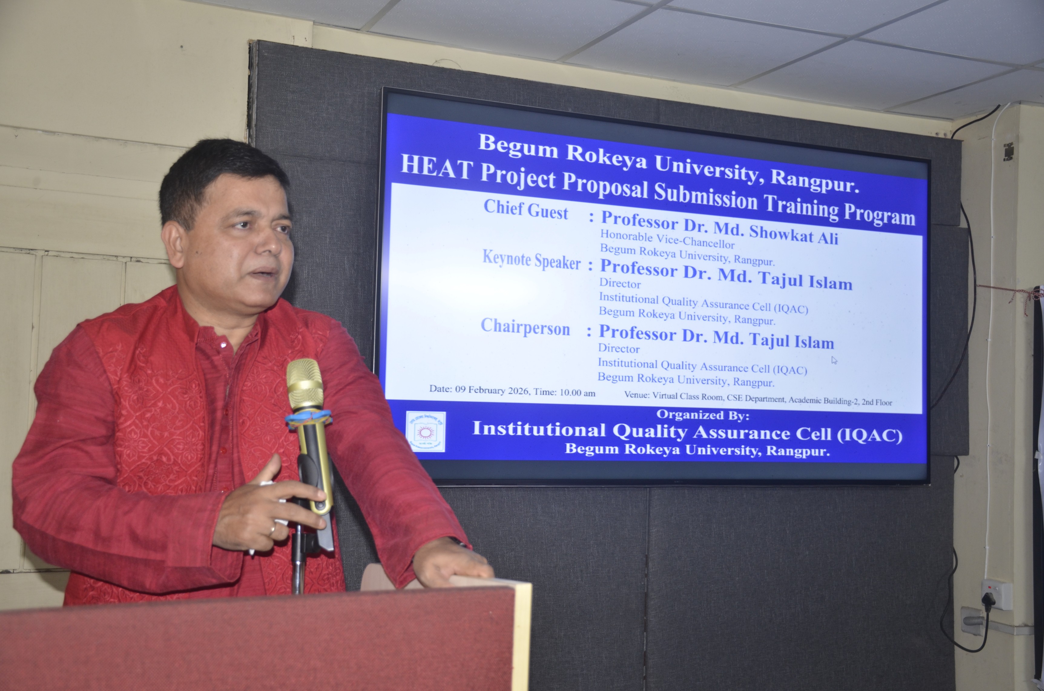 বেগম রোকেয়া বিশ্ববিদ্যালয়, রংপুর-এ  ÔHigher Education Acceleration and Transformation (HEAT) Project Proposal Submission’  শীর্ষক প্রশিক্ষণ কর্মসূচি অনুষ্ঠিত হয়েছে। সোমবার (০৯ ফেব্রুয়ারি ২০২৬) সকালে বিশ্ববিদ্যালয়ের একাডেমিক ভবন-২ এর কম্পিউটার সায়েন্স অ্যান্ড ইঞ্জিনিয়ারিং বিভাগের ভার্চুয়াল ক্লাসরুমে ইন্সটিটিউশনাল কোয়ালিটি অ্যাসিউরেন্স সেল (আইকিউএসি)-এর আয়োজনে এ প্রশিক্ষণ কর্মসূচিতে প্রধান অতিথি হিসেবে উপস্থিত ছিলেন বিশ্ববিদ্যালয়ের উপাচার্য প্রফেসর ড. মোঃ শওকাত আলী।