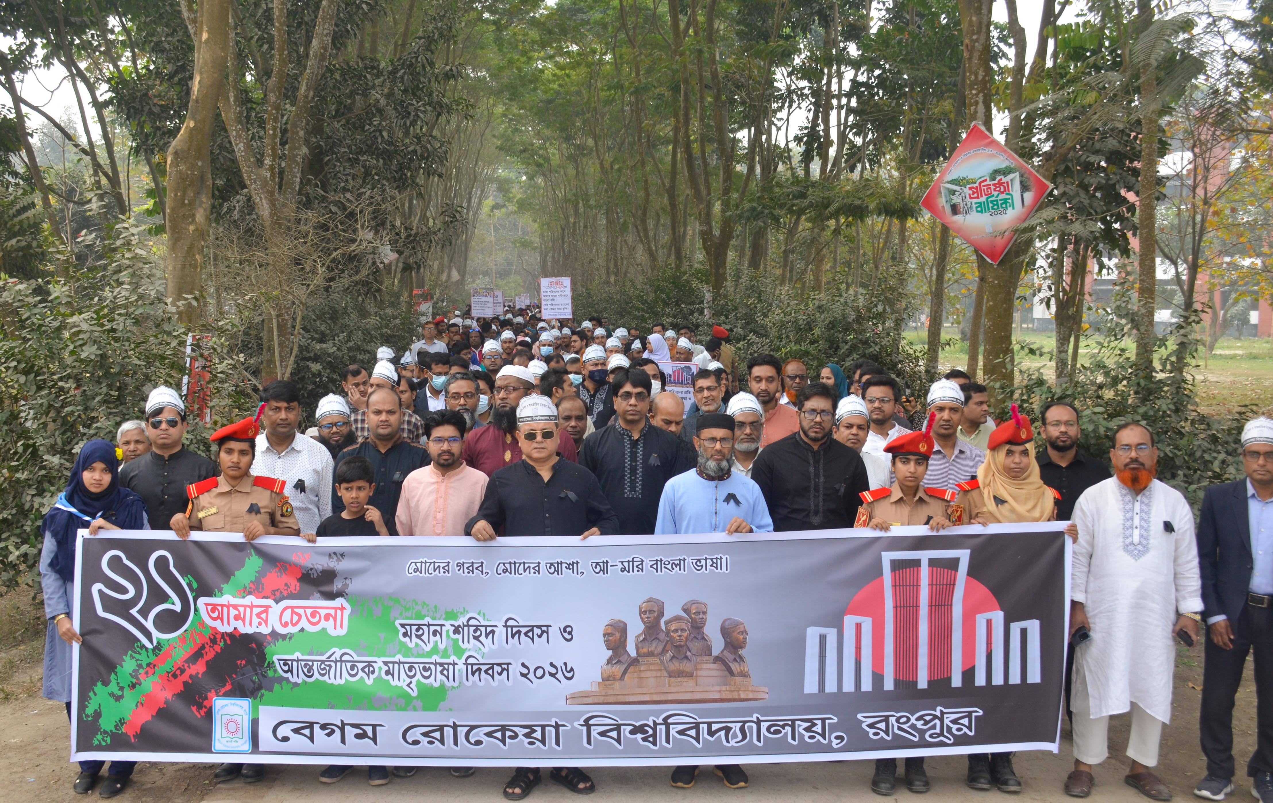বেগম রোকেয়া বিশ্ববিদ্যালয়, রংপুরে যথাযোগ্য মর্যাদায় মহান শহিদ দিবস ও আন্তর্জাতিক মাতৃভাষা দিবস-২০২৬ পালন করা হয়েছে। শনিবার (২১ ফেব্রুয়ারি, ২০২৬) সকালে বাংলা ভাষার জন্য অকাতরে প্রাণ বিলিয়ে দেওয়া ভাষা-শহিদদের প্রতি শ্রদ্ধা জানিয়ে শোক র্যালির উদ্বোধন করেন বিশ্ববিদ্যালয়ের উপাচার্য প্রফেসর ড. মোঃ শওকাত আলী। শোক র্যালিতে বিভিন্ন অনুষদ, বিভাগ ও দপ্তরের শিক্ষক, শিক্ষার্থী, কর্মকর্তা ও কর্মচারীগণ অংশ নেন।